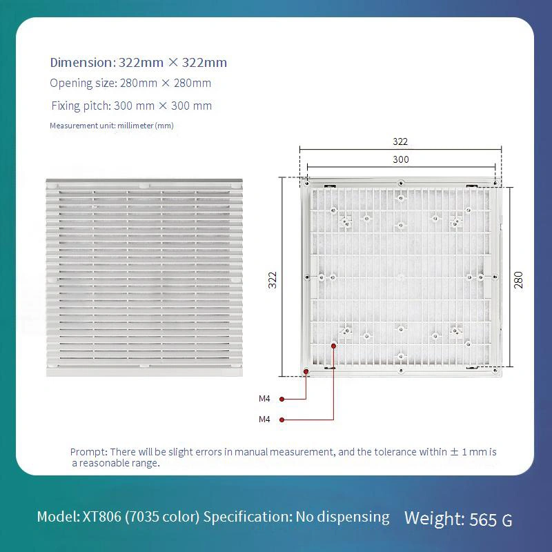 स्थापनेसाठी केवळ माउंटिंग पृष्ठभाग साफ करणे, धूळ कव्हर संरेखित करणे आणि त्या जागी दाबणे आवश्यक आहे. साफसफाईसाठी व्हॅक्यूम क्लीनर किंवा संकुचित हवेचा वापर करून धूळ जमा करण्यासाठी तिमाही तपासणी आयोजित करण्याची शिफारस केली जाते. संरक्षणाची प्रभावीता राखण्यासाठी जेव्हा वायुवीजन कार्यक्षमता लक्षणीय घटते किंवा नुकसान होते तेव्हा त्वरित पुनर्स्थित करा.